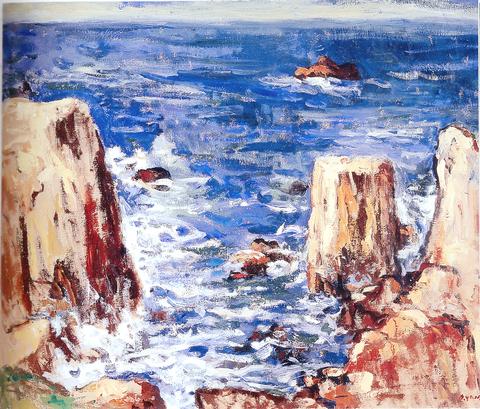 The show begins with a look at artists who worked during the 50 years of Japanese colonial rule. Their artwork reveals the influence of their Japanese teachers, many of whom studied in Europe and passed on the aesthetics of Impressionism popular at the time. Some, including Yang San-lang (楊三郎) and Chen Te-wang (陳德旺), studied in Japan. Chen's Mt Kuanyin, characterizes the impressionistic style with its quick strokes and globs of paint. Most of the paintings in this section focus on landscapes and figures, with Scenery with Coconut Trees by Liao Ji-chun (廖繼春) and Countryside in Taiwan by Lan Yin-ding (藍蔭鼎) -- one of the rare watercolor painters -- depicting quaint rural and natural scenes from a pre-industrial Taiwan. Another of the styles acquired from Japan is gouache painting, which in the show is represented by Lin Yu-shan's (林玉山) Lily Pond, which was also recently used as the backdrop for Cloud Gate Dance Theatre's Nine Songs.