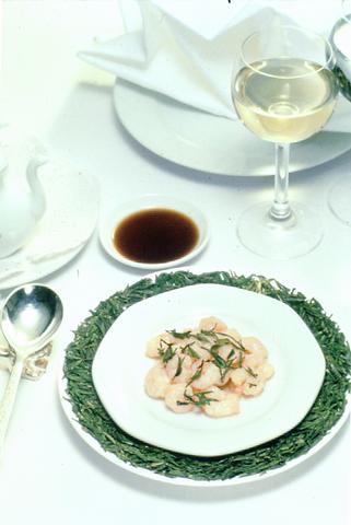 Sauted shrimp with long-ching tea leaves (龍井蝦仁) is a delightful representative Hangchow dish. Instead of using vegetables, the chefs saute the shrimp with freshly pickled long-ching tea leaves. The shrimp come out white and tender, while the tea leaves add an elegant presentation and delicate taste.
