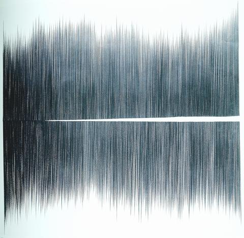 Gold-medal winner in the drawing category deals with a much lighter theme. Hills (山丘), by Pan Jen-song (潘仁松) -- whose prints have been exhibited in six previous biennials -- is a delightful work blending abstract and realistic techniques to show the landscape of Yangming mountain, where Pan lives. The idyllic scenery is portrayed with thin pencil and ink strokes in dots and lines. Inspired by nature and childhood memories, the work does not strictly correspond to any actual scenery in Yangming mountain, but "is meant to stimulate the viewers' imagination, so that different viewers see different sceneries in the drawing," Pan said. The occasional use of light yellow gives the landscape rhythm and a pulsing warmth.