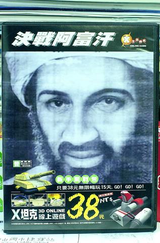 They decided to include an Afghanistan-looking desert map in the Korean-made online computer game X-Tank, which INSREA distributes in Taiwan, Hong Kong and China. The end product is Final Battle Afghanistan X-Tank, the game packaged with the black-and-white mug of bin Laden which is available for NT$38 at 7-11s and software stores around the country.