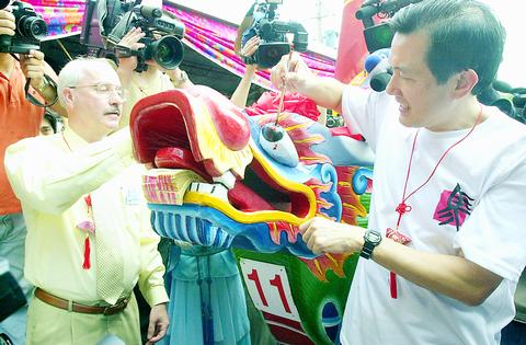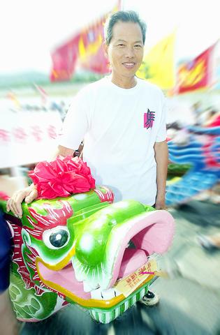 Controlling the rudder during the race will be Liu Ching-cheng (劉清正), one of the last professional builders of dragon boats in Taiwan. With the training session called off, Liu settled down under the eves of the Tiente Temple (天德宮) to talk about the dying art that he continues to practice. Around the temple are some printed materials and photographs declaring him Taiwan's last master boat builder. Liu, a vigorous 62-year-old who could pass for 40, is clearly tickled by the attention, if a little bewildered by it.