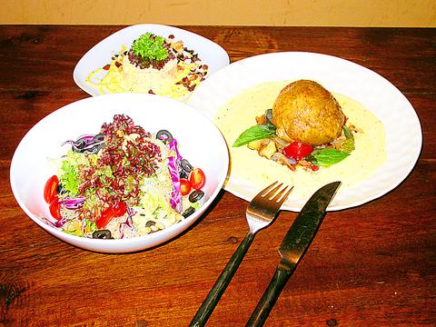Roast stuffed chicken thigh with mushrooms (NT$360) is an example. The fresh and tender chicken thigh is first skinned, degreased and flavored. The skin is then prepared and wrapped back around the meat. The ensuing juiciness of the meat is enhanced by a spiced cream sauce. Great care has been taken with the accompanying vegetables. Stewed eggplants, sweet peppers and sour cucumbers seasoned with an array of herbs leave a lingering fragrance in your mouth.