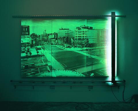 Yuan Goang-Ming's digital photo series City Disqualified shows the busy urban Hsimen District by day and by night, completely devoid of human inhabitants, a city that is silent, that is unfit. In Human Disqualified a moving scanner shines a light onto the photoluminescent pigment on the wall, making the image of the city appear and disappear by turns.