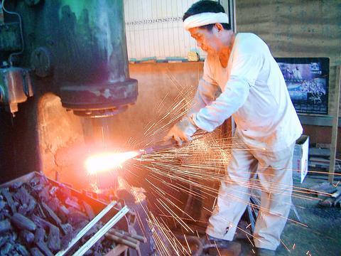 A third-generation blacksmith, Kuo learnt his skills at the age of 13. Now that he's 47 years old, he's still the only full-time worker at his sword-making factory. Every day he works by the forge sweating in the 700°C temperatures. Kuo said a good sword should be forged over 100 times, sometimes in temperatures as high as 1300°C.