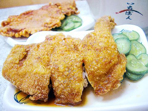 When they come out of the frying basket, Yu-lin's chicken legs look as if they're wearing a shiny golden armor, which preserves the juiciness and freshness of the meat. When served, the legs are sprinkled with dark soy sauce and garnished with cucumber slices. With one big bite of the leg, you can enjoy a mixture of crispness, juicy meat and the sweet and sour tastes of the sauce.