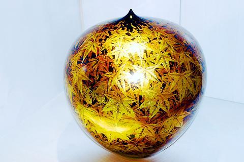 Another work is an alluvial bulb, smothered in countless coats of lacquer, called Butterflies Dancing Around Maple Leaves (