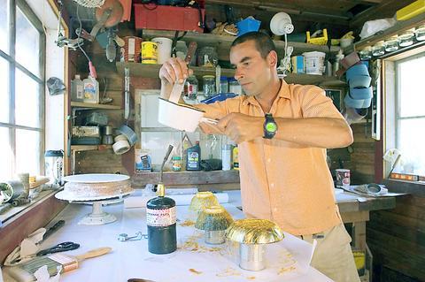 Without much space in his kitchen the baking is done in his shed. First, he attacked the workbench with a staple gun, covering WD-40 stains and dead wasps with a sheet of smooth white parchment paper. Over an upturned blowtorch, Sill stirred a saucepan of boiling caramel, carefully brushing down the sides of the pan with water in the approved cooking-school manner. As the mixture thickened to amber, he grabbed a couple of wooden dowels and started stringing long strands of thin caramel from the dowels to the floor. "You can break this up, stick it into a chocolate ganache tart, and you've got yourself a garnish," he said. "Beats the hell out of a mint leaf."