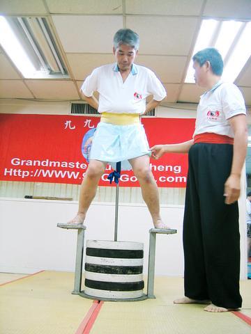 One such student is 62-year-old Shen Shyr-jong (申時中), who joins a group of a dozen men at the small second floor guan three days a week. There, under the glare of florescent lighting and the guidance of instructor Li Rong-chou (李榮秋), the group practice yin diao gong, or "genital hanging qigong."