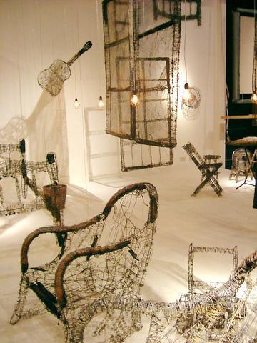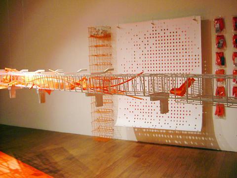 Ilan-based Huang Sheng-Yuan's (黃聲遠) walk-through installations of plastic-covered wooden planks, net-enmeshed TV sets and a mish-mash of building detritus gives the effect of both a construction site and a disaster zone. The incredible ambiguous mess makes us question whether this is a "before" or "after" site and it is that uncertainty that gives this work such a seductive quality, as it has a sense of being lived in.