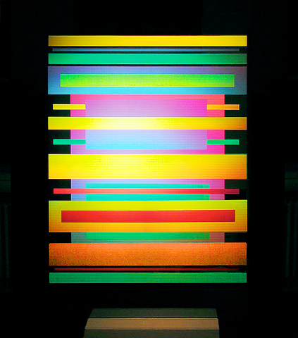 In holography, three-dimensional images are created on a flat surface through the diffraction of light waves with a laser. Many popular holographs contain representational images such as people, animals and buildings. In Jung's work, however, he shows that profound thoughts can be stated abstractly with only a simple line or shape.