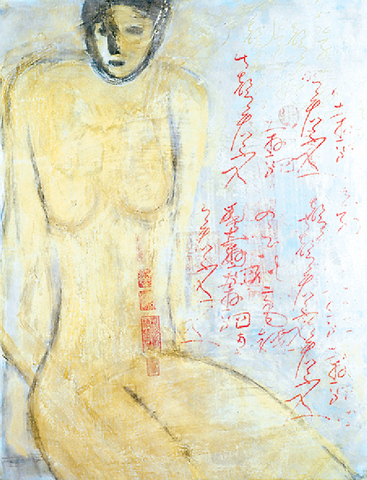 The ink stokes used to paint the female figure and the choice of red, black, white and gold colors are characteristic of Chinese brush painting. The calligraphy and chop markings that cover the body compliment the figure. A few of the images invoke memories of Peter Greenaway's The Pillow Book, in which a woman seeks lovers who will use her body like a canvas to write on. The women in Lee's paintings are often without any facial features, and sometimes even without heads. The anonymity gives them a nondescript yet indisputably feminine shape.