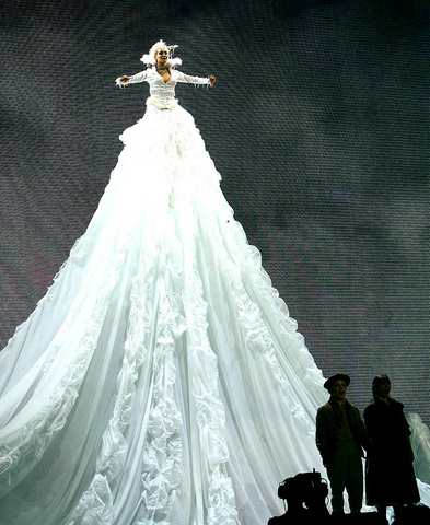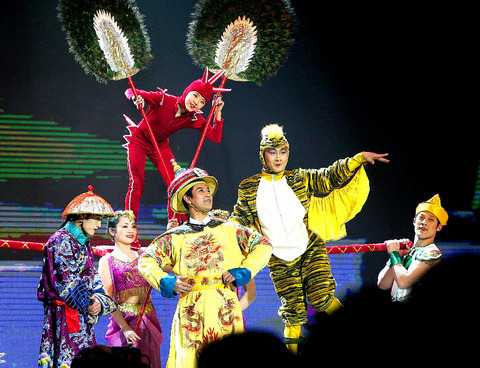 This international note was reinforced at Saturday's spectacle, Once Upon a Time, which was presented in English and televised in a half dozen countries. Between excerpts from a movie about Andersen's life projected onto three huge screens, singers and dance groups interpreted different fairy tales, starting with Jean-Michel Jarre's light-and-sound version of The Shadow and including Australia's Tap Dogs imagining The Red Shoes. A new UNICEF song composed by Carsten Morch was performed by Hayley Westenra of New Zealand and Morten Harket of Norway. The percussionists Safri Duo of Denmark interpreted The Steadfast Tin Soldier and the Shenyang Acrobatic Troupe of China did a daring version of The Nightingale.