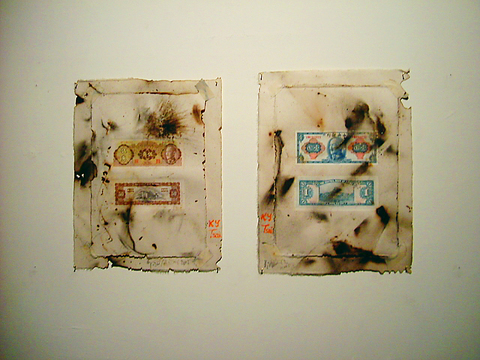 Mei Dean-E (梅丁衍) shows a brilliant piece. Redoing Joseph Kosuth's One and Three Chairs semiotic piece, which is considered the seminal work of Western conceptual art, and which consisted of a wall text of a dictionary definition of a chair, a photo of a chair and an actual chair, Mei recreates the piece using all Chinese elements: Chinese text and a Chinese chair. This clever recontextualizing of art history speaks volumes about Western and Chinese art.