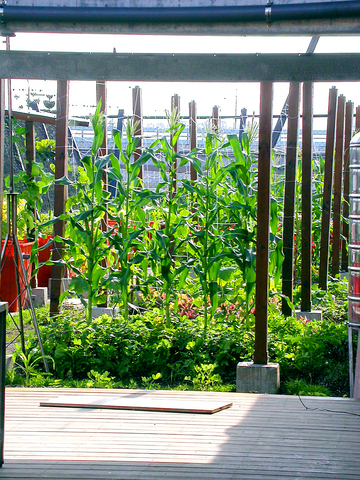 On one side of the roof is a fully developed garden growing corn, watermelon, eggplant, green beans, lettuce, squash and cucumber, while the other side is covered with an assortment of plants, grass and flowers. A wooden deck, small washroom facility and open kitchen area are being constructed in the center.