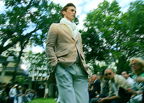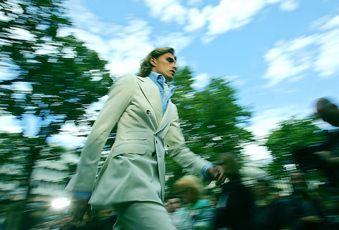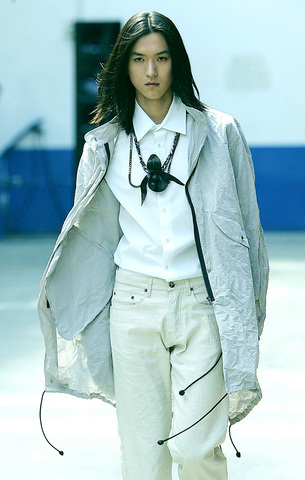 Long-haired, androgynous models sported full-cut trousers that were rolled above the ankle or roomy breeches, striped shirts that fell asymmetrically at the hip and full jackets in soft linen or cotton.