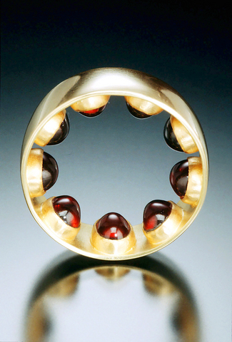 The men's and women's gemstone rings are a trademark item of Dong's, who first casts a gold or silver band, then inserts each stone by hand on the inside leaving a smooth polished band of silver or gold on the outside. Placing the stones on a band produces an effect that is less flashy and makes them ideal for men because they are chic, yet simple and masculine.