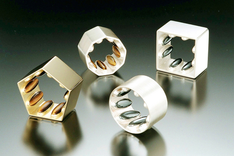 Yang Hsi-hsai's (楊夕霞) cage-like finger rings have an abstract allure and given their size are remarkably lightweight and comfortable to wear.