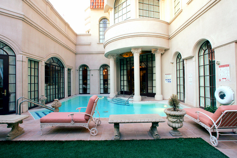 It's some suite. It came as part of his deal with the Hilton, and its amenities include an outdoor pool, which by some minor miracle of modern botany has a lawn around it. Seemingly every room inside has faux Corinthian columns and ceiling frescoes. There's a riot of gold paint, as if Midas didn't so much touch as grope the place. His marble master bathroom has two spas, one rectangular and one circular. It has a walk-in shower so