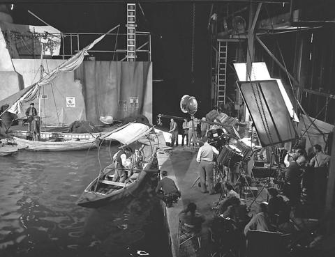 MGM's Stage 30 contained the most impressive set: the pool of MGM's amphibious star, Esther Williams. Typically, she and a couple dozen other bathing beauties would be splashing about. When the director approved a particular setup, an assistant would announce over a loudspeaker: ``Hit the kliegs.''