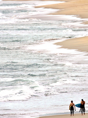 If Floripa is a potential Punta del Este, the center of the "scene" is Lagoa da Conceicao, a village set around the main lagoon in the heart of the island, beneath the wooded hills. Kite surfers skim the glassy water, dodging wooden boats ferrying tourists to seafood restaurants on the far shores, and the sidewalks have the air of a hip southern Californian beach town: bustling surf shops, trendy coffee bars and an excellent gourmet "kilo restaurant" called Um Rosa, where regulars pile up huge portions of fresh fish, mussels, salads and organic meats from a buffet bar for 22 Brazilian reais a kilo (NT$336).