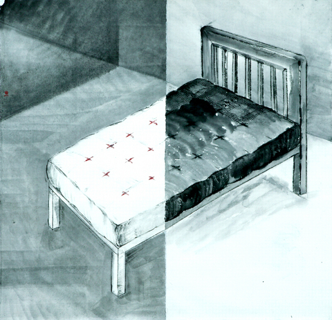 The Bed refers to the time the artist was catheterizing his elderly infirm mother: "Being old and sick is so sad; it forces Mother to be naked in front of me. It took away her privacy and hurt our dignity."