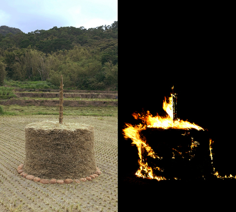 A 4m-high pile of hay suddenly bursts into flames. At first glance, the video seems part of a typical farming scene, with people stomping the rice hay into a cylindrical dome after the harvest. Yet, the hay is used for tinder throughout the year and is never burned all at once. So, burning the stack like a bonfire, then becomes the artist's iconoclastic metaphor for destroying "the Father."