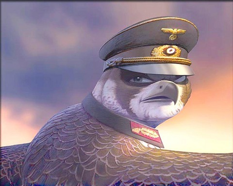 His too-cute motto exemplifies the goody-goody tone of this World War II cartoon in which the British Royal Air Force has morphed into the Royal Homing Pigeon Service, or RHPS. The German Luftwaffe has become a flock of sadistic falcons decked out in shiny black leather and matching eye patches, obsessing neurotically about the colors of their capes.