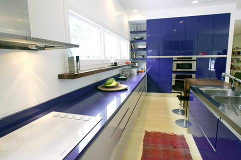 Considering a kitchen remodel? Check out the Leaos' Berloni, Italy, open kitchen with its blue lacquer cabinets, man-made Zodiac quartz countertops, walnut bar area, clear acrylic backsplash and General Electric appliances.
