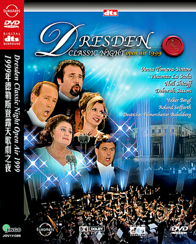 The main feature recommending the live outdoor concert filmed in Dresden in 1999, Dresden Classical Night, is the presence of the fine Bulgarian-born soprano Anna Tomowa-Sintow. Predictably, she gives a superb performance. But there are six soloists in all, so none of them gets that much screen time. They end up singing the Brindisi from La Traviata together, a bizarre event indeed. The other soloists are Deborah Sasson, Vincenzo La Scola (who sings Gabriele Adorno in the Boccanegra reviewed above), Neil Shicoff, Volker Bengl and Roland Seiffarth.