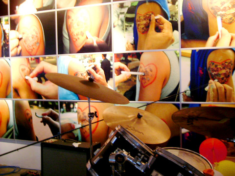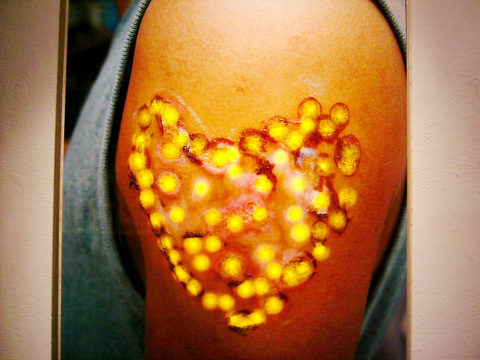 At IT Park, performance artist Cheng Shih-chun (鄭詩雋) has become a transgressive rock star. Photos of a previous event show passers-by stamping out cigarettes into a heart shape drawn on his upper arm as if to say love hurts. To further make his point, photo lightboxes glow brightly where the embers burned his skin. A drum kit, guitars and amps are strewn throughout the gallery. This is no commercial exhibition, as sex toys, cash, and butts are the detritus of the painful and difficult passage of adolescence into adulthood.