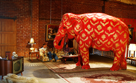 The previous night, at the glamorous opening in the decidedly un-Beverly Hills setting of a disused warehouse at the end of a cul de sac nestled close to a downtown freeway interchange, the elephant had upstaged some of Hollywood’s finest. Painted red, adorned with gold fleur-de-lis, the elephant merged into the wallpaper behind it. There was nothing that Brad Pitt and Angelina Jolie could do other than gawp.