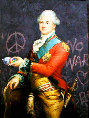 The show includes pieces of British iconography, such as a Guardsman on Horse Guards Parade atop a pantomime horse, in addition to work aimed specifically at the local audience. A police van dominates the entrance to the exhibition, decorated with a picture of Dorothy from The Wizard of Oz carrying a noose. Occupying an entire wall next to it is a painting reinterpreting an American icon, the raising of the flag at Iwo Jima. In Banksy’s interpretation, the scene is given an urban setting with a group of protesters raising the flag on top of a car.