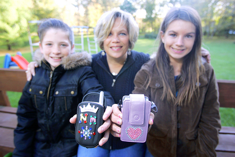 Marcia Murphy, of Delaware in central Ohio, decorated her leather cell phone case with pink and silver removable adhesive sequins to match her pink Motorola MOTORAZR phone. Murphy's daughters, ages 10 and 11, also used the sequins to decorate the case for the cell phone they share.