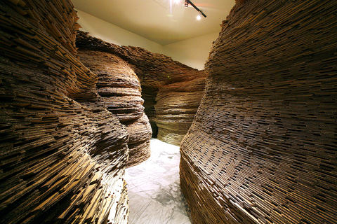 Huang Pei-ying (黃沛瀅) has been showing her installations for several years of glued pieces of corrugated cardboard that form organic shapes, often shaped like pretty decorations, but the cave-like piece shown here, titled Flowing, becomes a seamless merging of art, architecture and sound.