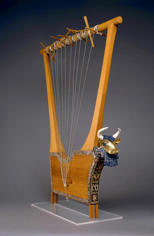 Starting with stone chopping tools from around 2.5 million years ago we are offered a package tour-like view of history. A beautifully restored lyre, which is estimated to be 4,500 years old, is one of two retrieved from the grave of Queen Puabi. It was found with a sacrificial victim lying against it, the bones of her hand placed against where the strings would have been.