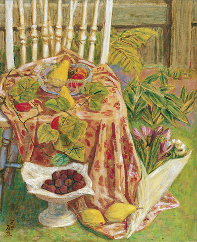 The painting Still Life, exemplifies Li's mastery of line and form, with firm brushwork and radiant colors.