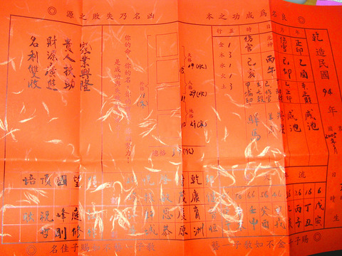 But fortune-tellers are not the only ones providing new names to the unlucky. On rare occasions, gods will grant an auspicious name to those in need. Taipei resident Lin Hsien-chien (林新建), 32, said that when he was younger he his health was poor. His mother prayed to the deity Matzu to provide him with a new name. Her prayers were answered.
