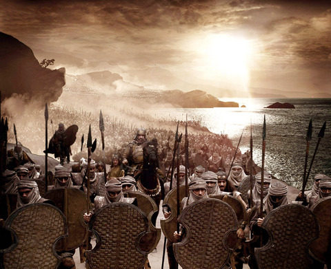 So just how Spartan were the bluescreen stages? Parts of the city of Sparta were physically constructed, as was some of Thermopylae's rocky terrain. Most everything else, though — mountains, roiling seascapes, surrealistically atmospheric skies — was achieved via some 1,300 visual-effects shots.