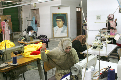 Inside it is cold and dank like a factory, with cement floors, walls and ceilings. There are four or five sewing machines in the work space. There is a large picture of Brother Leader leaning against one wall, and racks of clothing that speak to her goal of fashioning Libyan identity in a modern context.