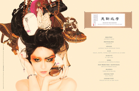 Illustrating the relationship between feminine ideals and fashion is Jeffrey Wang's (王九思) witty 24 Xiao (二 十 四孝), a series of exquisitely rendered c-print posters that appropriate the traditional Chinese concept of filial piety. Taking idealized notions of how women should look, the artist fuses each image with objects of desire. The images are both decadent and banal in their use of symbols, and the artist employs a satirical visual language that is at once low and highbrow.