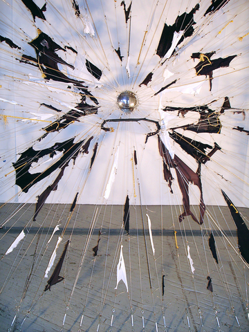 E.V. Day's installation titled Chanel/Shazam explodes — literally — a garment of Chanel clothing and then suspends the cotton shrapnel from fish wire. Harking back to 1960s and 1970s feminist thought, in which clothing is intimately tied up with freedom and subjugation, Day's work menacingly illustrates the predicament still faced by today's women.