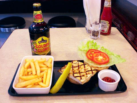 A healthier sounding choice is the salmon burger, which consists of a fillet of sashimi grade Canadian freshwater salmon, grilled and served with pesto mayonnaise on a whole-wheat bun. For vegetarians, the tofu burger is prepared with a sesame and ginger glaze.