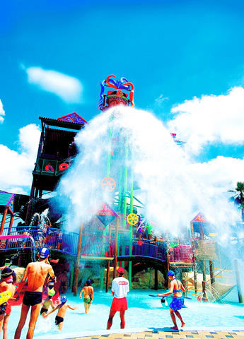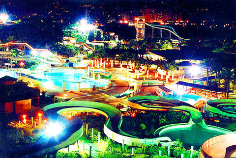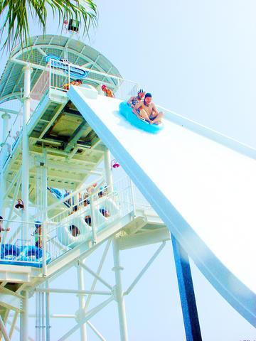 Besides the speed slides, Formosa Fun Coast also features the UFO Expedition, a four-person tube ride that was completed last September. It's 220m long and 22m high, which, according to Ivy Wang (王懿君) of Formosa Fun Coast's ticketing services, makes it the longest and tallest family slide in Asia. Riders are tossed about through a series of twists and turns before finally reaching safety in the landing pool.