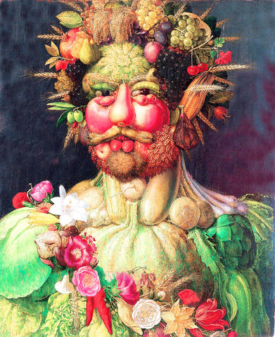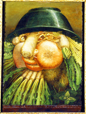 All artists have their niches, and this commonplace slip of the mind became for Arcimboldo a virtual cottage industry. A bust of a bearded librarian, with a tin-man face made of books, and bookmarks for fingers, is a clever feat of virtuosity, like the reversible pictures he painted: right side up, they're still lifes; upside down, portraits.