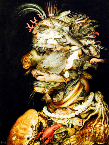 There, he finally cooked up his famous faces. They satisfied a taste for exoticism. This was the era of high humanist curiosity. Newly rediscovered ancient texts like Pliny's Natural History circulated among scholars and artists; in the show, Archimbold's watercolors of animals and fish, exacting models he adapted for parts of faces, show him to be firmly grounded in science and real observation. Global exploration and advances in fields like optics and engineering stirred Rudolf, like other enlightened patrons, to wish to possess whatever was the rarest, the finest, the strangest, the most inexplicable art and artifacts. From such cabinets of curiosities - attempts to catalog and rationalize the irrational - evolved, one day, the modern museum. This was Arcimboldo's milieu and motivation.