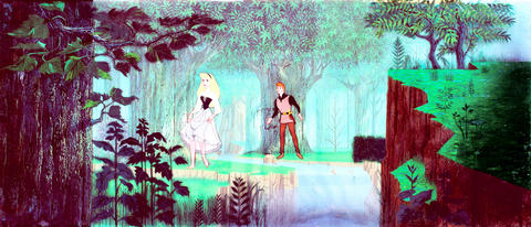 Among other striking works is a sequence of images by the designer Eyvind Earle that show how he created the stylized forest backgrounds for Sleeping Beauty. The delicate clusters of leaves and intricately textured bark on the trees reflect Earle's interest in 15th-century French manuscripts and the painting of Van Eyck, and foreshadow his later serigraphs.