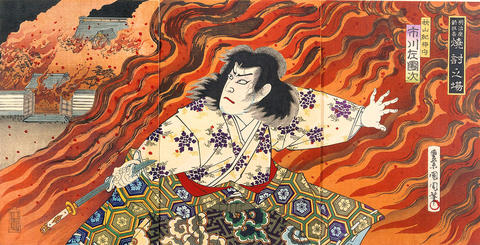 Also extraordinary is Toyohara Kunichika's dramatic wide-angle picture from 1894 of an actor dressed in a sumptuously patterned costume surrounded by vividly colored flames. With a fierce expression on his face, he poses with extended arms; holding a sword in one hand, he prepares to commit seppuku, or ritual suicide.