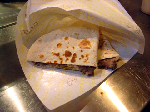 The portions are on the smaller side, so for a full meal order a burrito and quesadilla, or two burritos if you’re really hungry. Vegetarians can order either item without the chicken, with grilled onions and extra refried beans as a substitute.