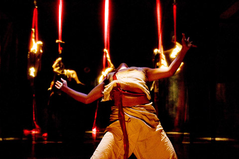 Each scene evoked a different emotional landscape. One of the more mesmerizing saw the svelte dancers chanting and howling around a bonfire to the eerie sound of a cello, gong and drums. A few scenes were quite jarring, such as one that showed bodies hanging from the ceiling by red ropes.