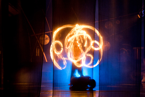 Meanwhile at the Bamboo Studio Theater (竹圍工作室), Sun Son Theater (身聲演繹劇場) staged a revival of its Aurora (光音) production to a packed house. Friday’s performance, in celebration of the troupe’s 10th anniversary, was a captivating fusion of modern theater, dance and world music, with fire dancer Chang Yu-wei (張育瑋), also known as Huo Pao (火寶), illuminating the stage while the actors, led by Chien Yan-chen (簡妍臻) and Chang Wei-lai (張偉來), were silhouetted behind gauzy black curtains, behind which they could be seen twitching, tossing, twirling and shouting.